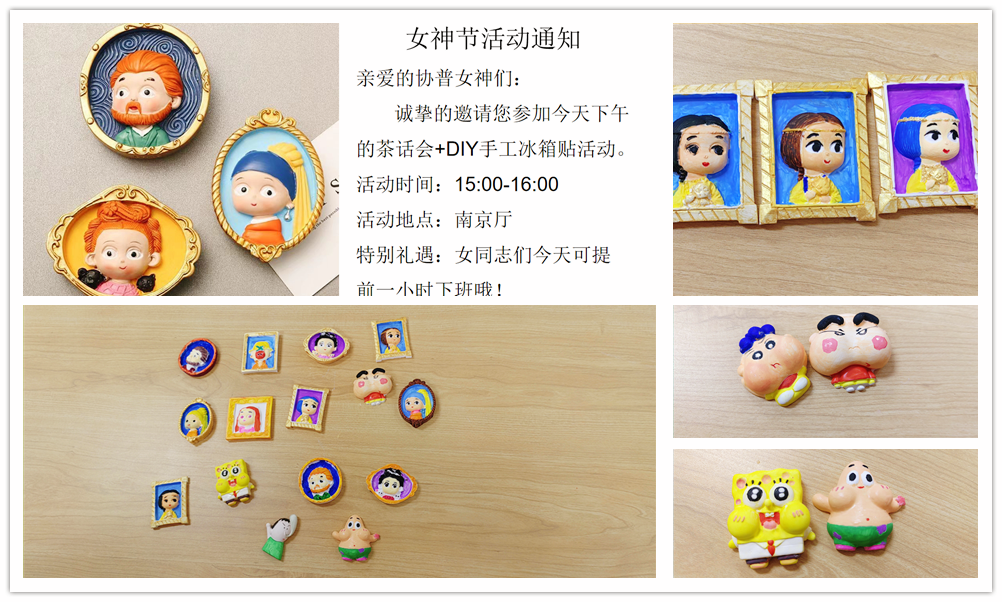 2023年3月8日,值此婦女節(jié)到來(lái)之際,協(xié)普不僅為在廠(chǎng)的各位女士準(zhǔn)備了暖心的生活禮品,還將大家聚在一起舉辦了輕松愉快的手繪活動(dòng)?,F(xiàn)場(chǎng)氣氛歡快,大家悠閑地完成了各自的手繪冰箱貼,活動(dòng)結(jié)束后全體女同志提前下班,開(kāi)心地結(jié)束了一天的工作。